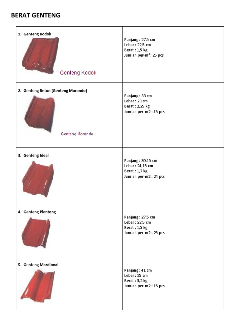 Diposting pada 6 maret 2019. Genteng,macam macam genteng dan harganya,model harga genteng tanah liat,m class genteng,jarak reng genteng beton flat,harga genteng arcon,bahan genteng,distributor keramik kia,harga genteng pasir,genteng jatiwangi murah jumlah genteng per m2, 081945360208. Kebutuhan genteng garuda per m2 ukuran 30 cm x 24 cm dengan berat 2.6 kg per buah = 18 bh/m2. Kebutuhan jumlah batu bata ini nanti bisa kita dirumuskan menjadi berapa jumlah batubata yang dibutuhkan dalam pemasangan 1 m2 dinding bata. Mahasiswa dapat menentukan berat genteng per m2 atap d.